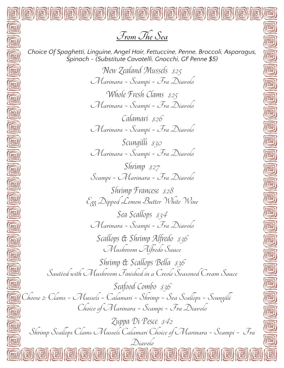 Shrimp Scallops Clams Mussels Calamari Choice of Marinara Scampi Fra Diavolo